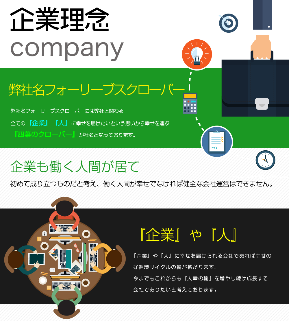 企業理念|総合広告代理業・経営コンサルタント業・ポータルサイトの管理運営 株式会社フォー・リーブス・クローバー